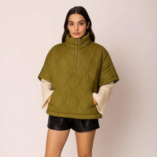 Oversized Quilted Half Zip Poncho in Chartreuse