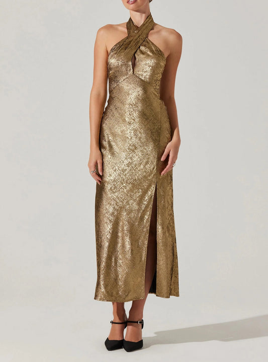 Astr the Label Marissa Halter Neck Midi Dress in Gold
