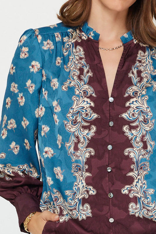 Split Neck Floral Button Front Top in Burgundy/Blue