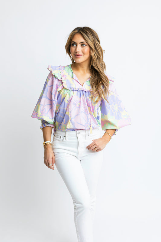 Karlie V-Neck Ruffled Top in Lavender Pastel Floral