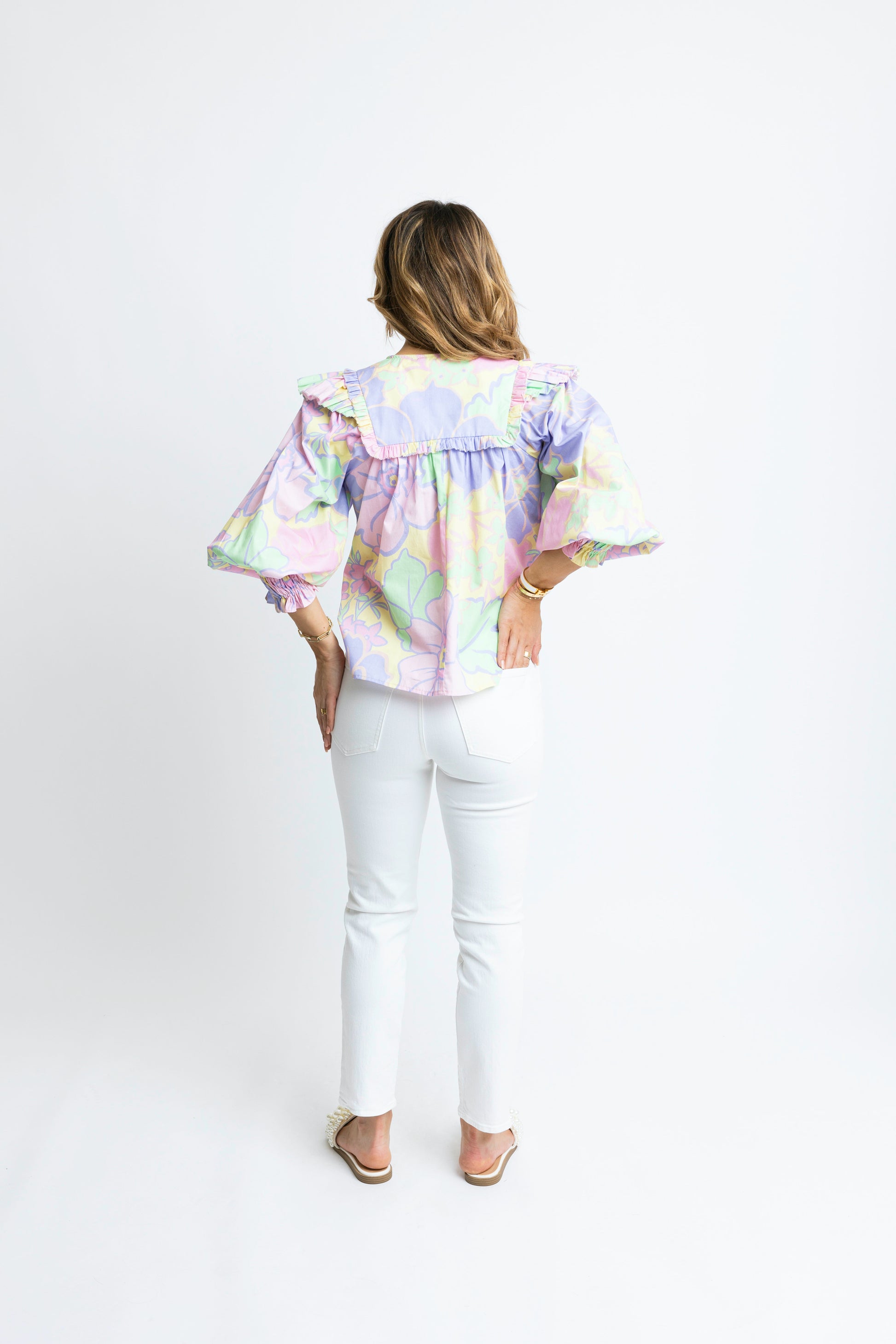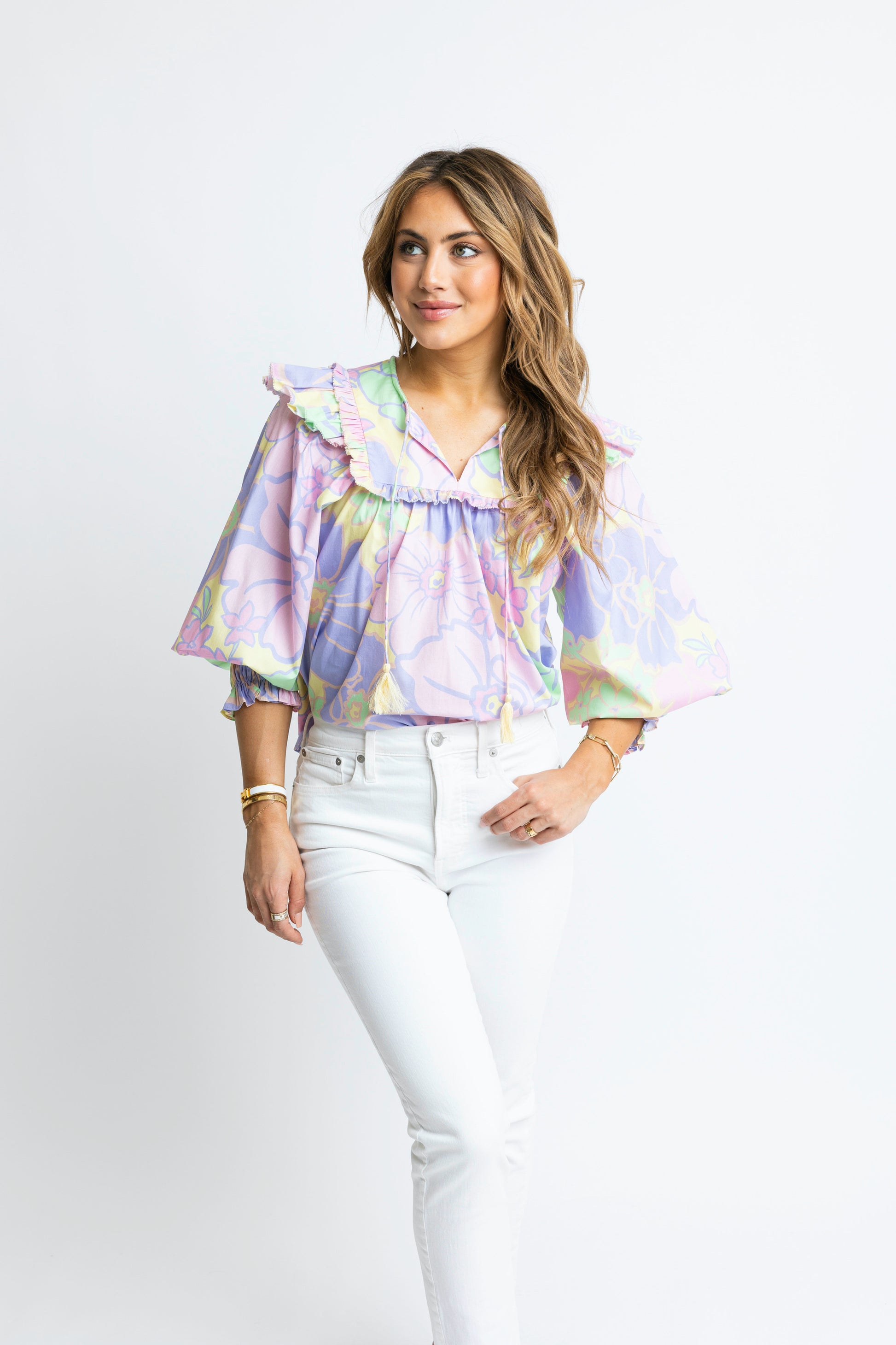 Karlie V-Neck Ruffled Top in Lavender Pastel Floral
