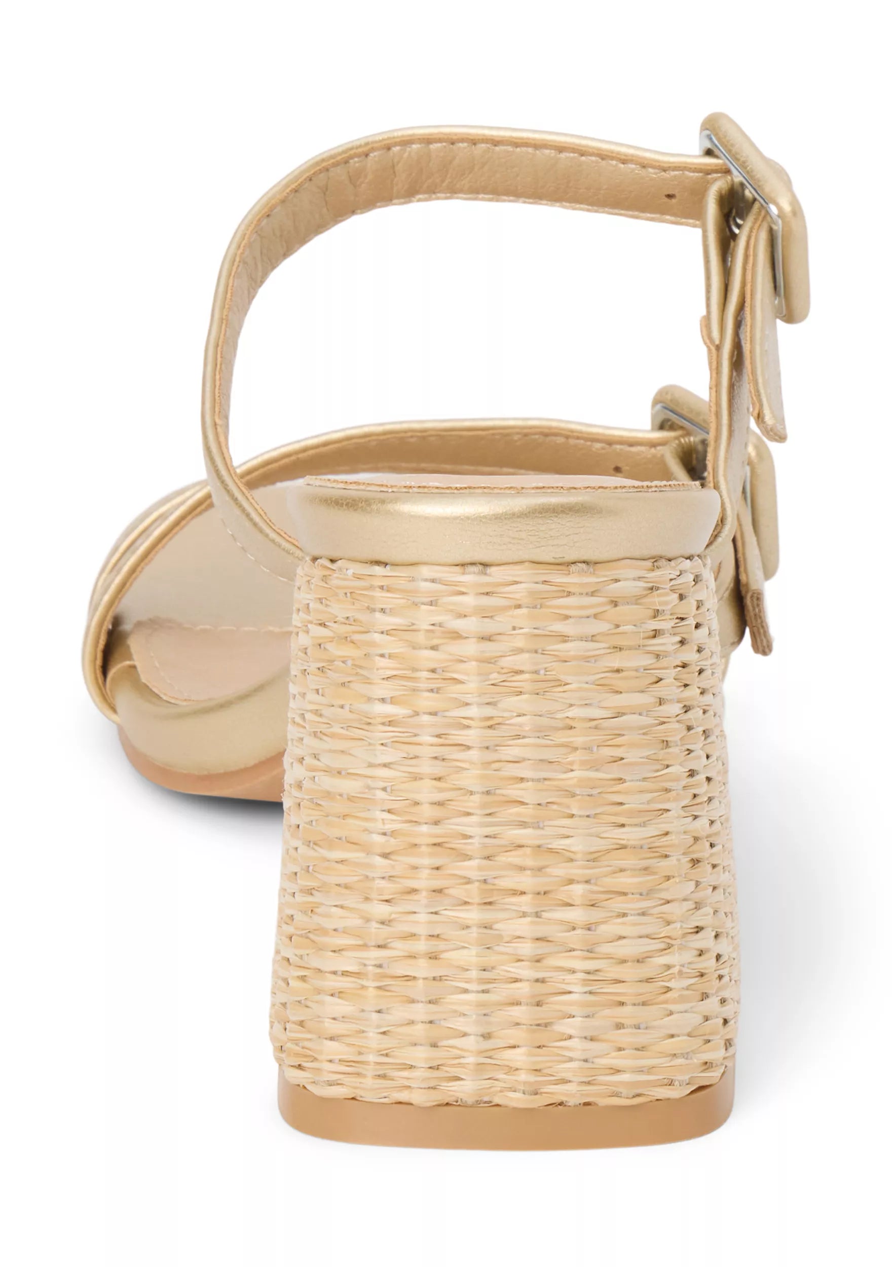 The Luau vegan heeled sandal by Beach by Matisse features a gold faux leather upper with double buckle straps and a woven block heel for a polished, warm-weather look.