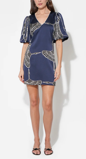 Sylvie V-Neck Bubble Sleeve Mini Dress in Bird Print Blue